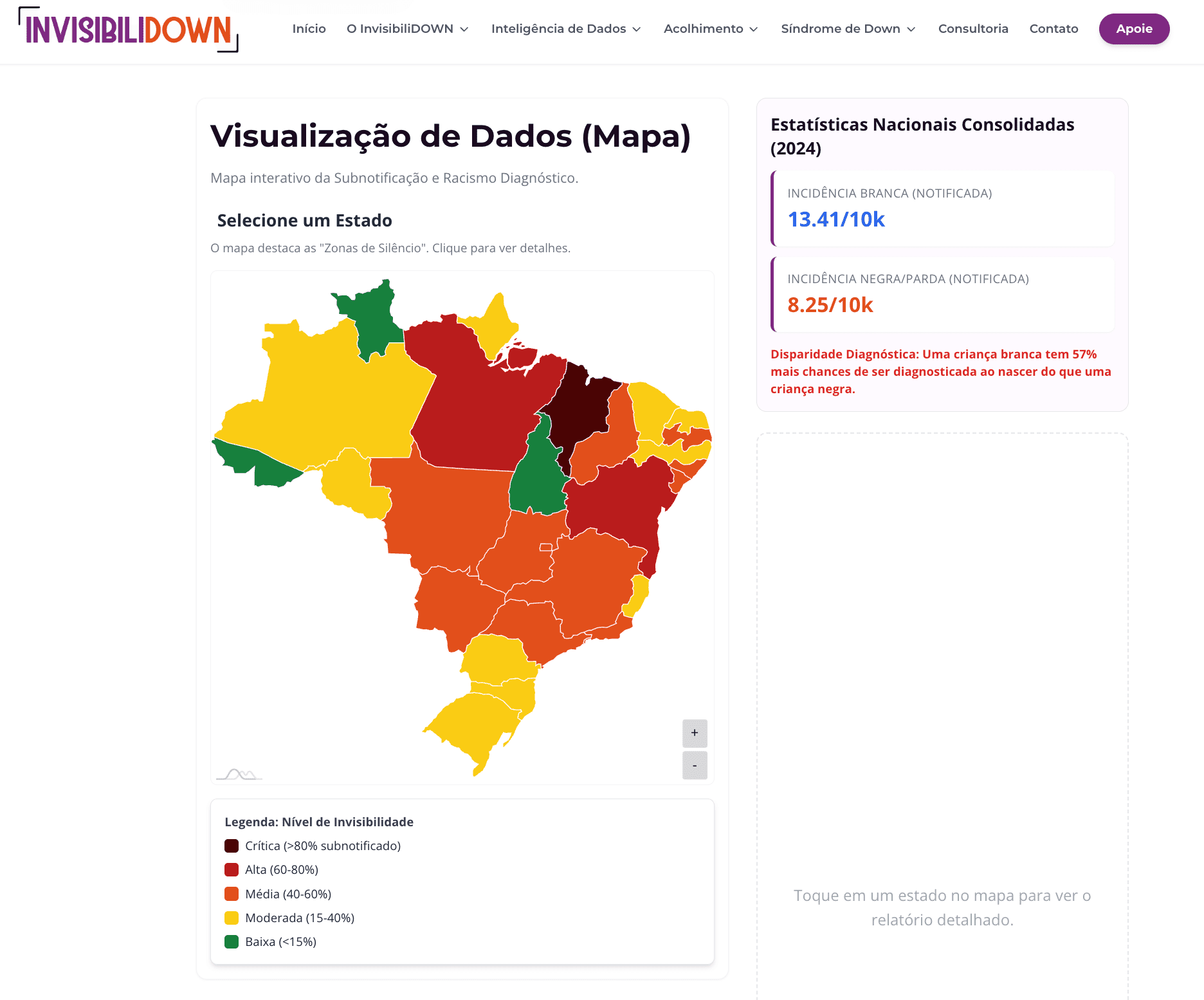 Para enfrentar essa realidade, o Instituto InvisibiliDOWN desenvolveu o Mapa da Invisibilidade, uma ferramenta inédita no Sul Global e talvez no mundo. O mapa cruza dados oficiais do SINASC (Sistema de Informações sobre Nascidos Vivos) - o sistema do Ministério da Saúde o Brasil que coleta e organiza dados de todos os nascimentos ocorridos no país, usando a Declaração de Nascido Vivo (DN) como documento base - com indicadores territoriais, raciais e socioeconômicos para identificar onde os diagnósticos não estão acontecendo — e para quem.